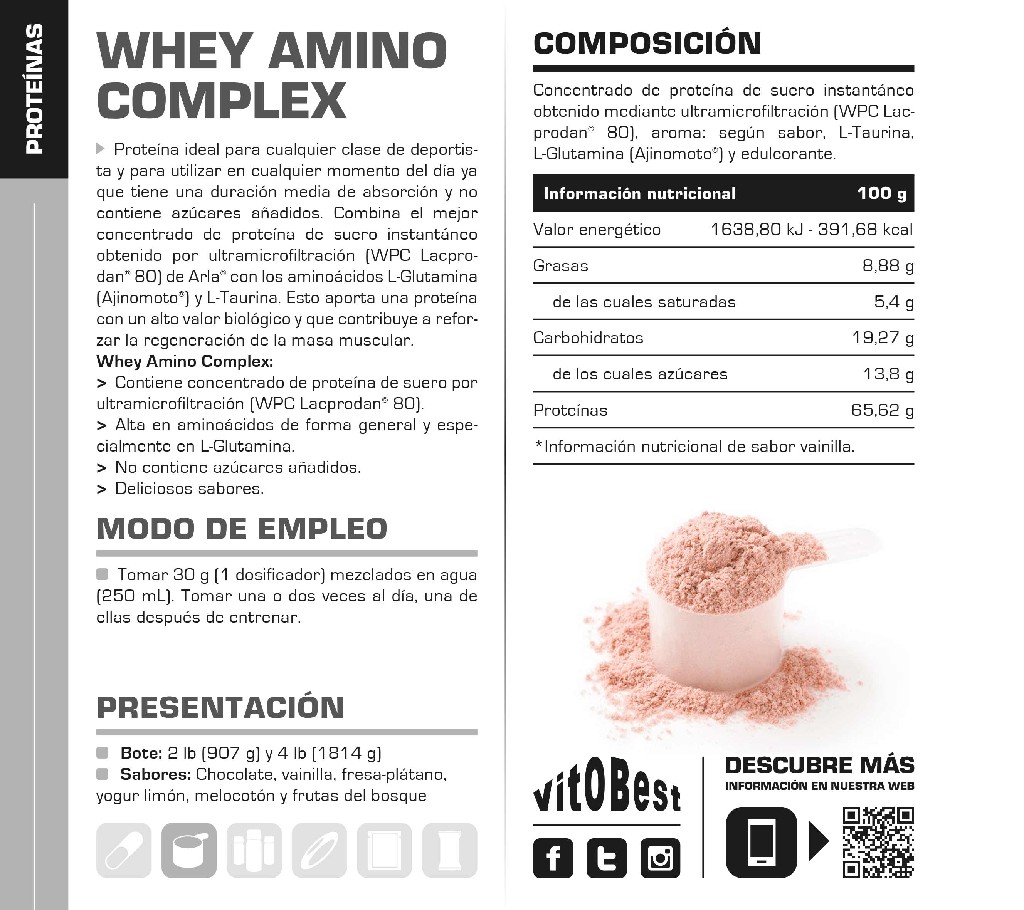 Whey Amino Complex, de Vitobest®, combina el mejor concentrado de proteína de suero instantáneo obtenido por ultramicrofiltración (WPC 80), con L-Glutamina (Ajinomoto®) y L-Taurina para obtener la proteína ideal para usar en cualquier momento del día.Con una duración de absorción media y sin azúcares añadidos, esta formulación ayuda a nuestro organismo a aumentar y conservar nuestra masa muscular, contribuye al mantenimiento de los huesos, evita el catabolismo muscular y nos permite aprovechar al máximo nuestros entrenos.Whey Amino Complex de Vitobest®:Utiliza concentrado de proteína de suero por ultramicrofiltración (WPC 80). Contiene L-Glutamina de Ajinomoto®. No contiene azúcares añadidos. Declaraciones del producto (claims):Las proteínas contribuyen a que aumente la masa muscular. Las proteínas contribuyen a conservar la masa muscular. Las proteínas contribuyen al mantenimiento de los huesos en condiciones normales.