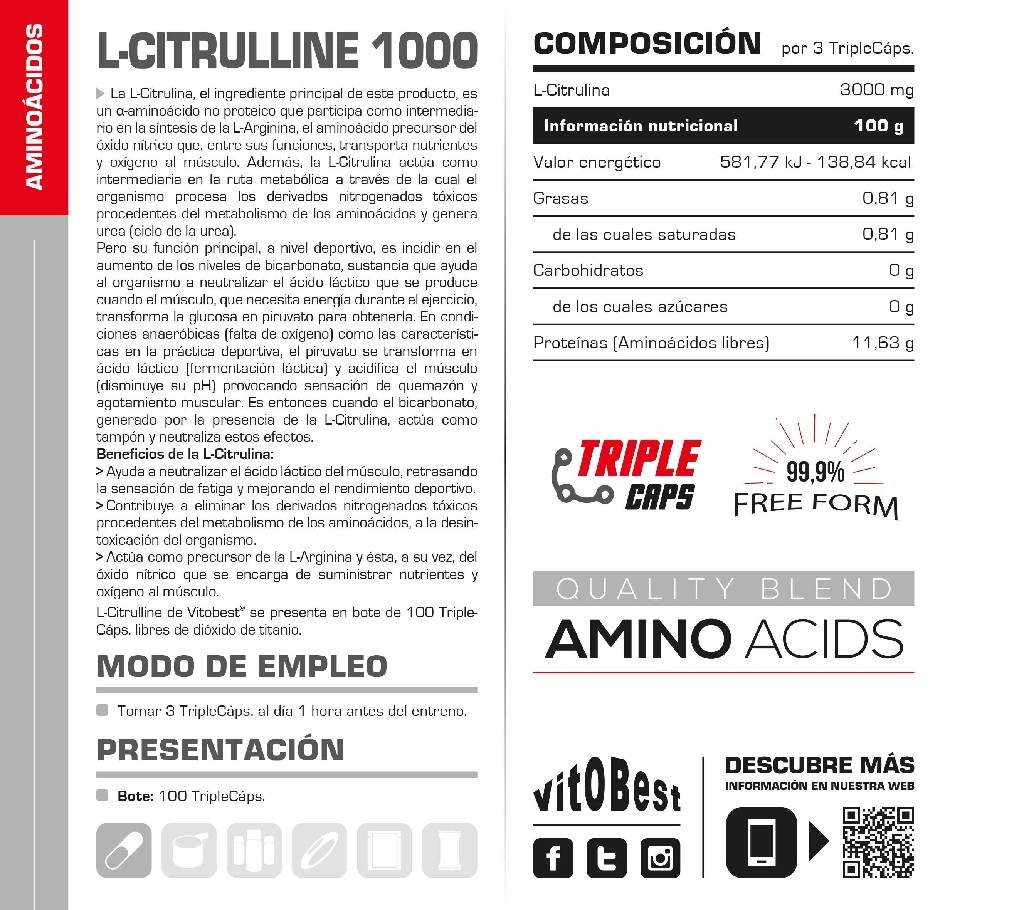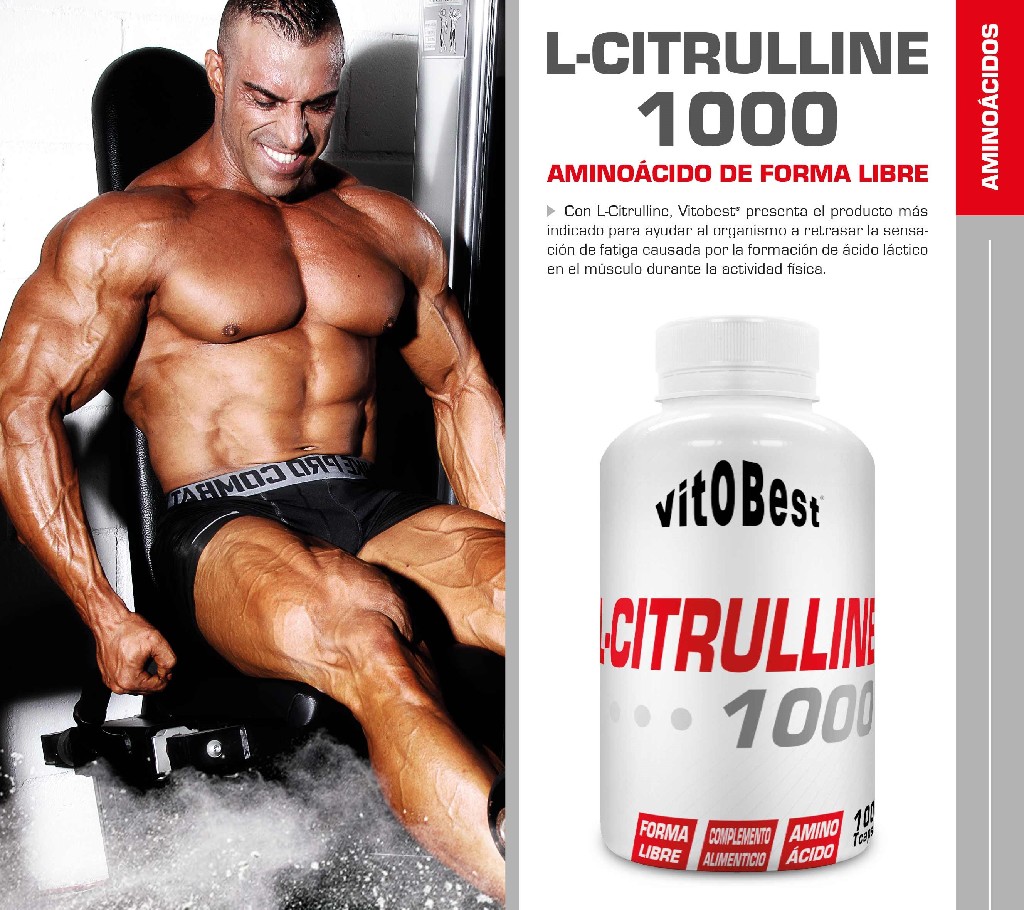 L-Citrulline 1000, de Vitobest®, es un producto más indicado para ayudar al organismo a retrasar la sensación de fatiga causada por la formación de ácido láctico en el músculo durante la actividad física.La L-Citrulina, es un α-aminoácido no proteico que participa como intermediario en la síntesis de la L-Arginina, el aminoácido precursor del óxido nítrico que, entre sus funciones, transporta nutrientes y oxígeno al músculo. Además, la L-Citrulina actúa como intermediaria en la ruta metabólica a través de la cual el organismo procesa los derivados nitrogenados tóxicos procedentes del metabolismo de los aminoácidos y genera urea (ciclo de la urea).Pero su función principal, a nivel deportivo, es incidir en el aumento de los niveles de bicarbonato, sustancia que ayuda al organismo a neutralizar el ácido láctico que se produce cuando el músculo, que necesita energía durante el ejercicio, transforma la glucosa en piruvato para obtenerla. En condiciones anaeróbicas (falta de oxígeno), el piruvato se transforma en ácido láctico (fermentación láctica) y acidifica el músculo (disminuye su pH) provocando sensación de quemazón y agotamiento muscular. Es entonces cuando el bicarbonato, generado por la presencia de la L-Citrulina, actúa como tampón y neutraliza estos efectos.L-Citrulline 1000 de Vitobest®:Ayuda a neutralizar el ácido láctico del músculo, retrasando la sensación de fatiga y mejorando el rendimiento deportivo. Contribuye a eliminar los derivados nitrogenados tóxicos procedentes del metabolismo de los aminoácidos, y a la desintoxicación del organismo. Actúa como precursor de la L-Arginina y ésta, a su vez, del óxido nítrico que se encarga de suministrar nutrientes y oxígeno al músculo.